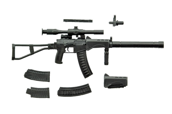 スペツナズの秘密任務の為に、旧ソ連で消音性能に特化して作られたサプレッサー内蔵式アサルトライフルのAS VAL。そのスナイパーライフル版のVSS。サプレッサーを無くして隠匿性能に振ったSR-3。3機種それぞれが持つ特性を、1機種に統合したものがSR-3Mである。サプレッサーは着脱式に変更され、全自動射撃に向いたフォアグリップと30連弾倉も新たに用意された。サプレッサーとスコープを装備して消音狙撃。それらを外して隠し持ち、緊急時にはフォアグリップ掴んだ全自動射撃で相手を圧倒…まさに特殊作戦の為の銃である。当キットでは、30発弾倉、フォアグリップ付きハンドガード、サプレッサー有無のバレルを新規金型にて製作。実銃と同様、消音優先スタイルor隠匿優先スタイルが好みで選択可能。セフティレバーは可動式。PSO-1-1タイプスコープも付属。・消音狙撃銃スタイル or 隠匿優先小型銃スタイル がお好みで選択可・サプレッサーの有無・フォアグリップの起倒選択が可能・実銃の構成を意識したパーツ分割を可能な限り再現・安全レバー可動式・弾倉は20連・30連の2種類が付属。スコープの有無が選択可能※プラモデル用接着剤使用推奨